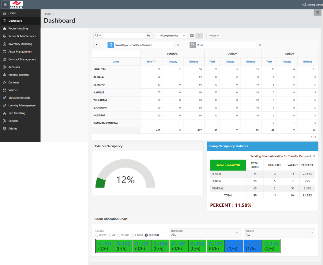 The CampSoft Dashboard shows the forecast summary, which helps management to track Camp Activities and make decisions.